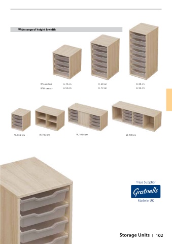 Wide range of height & width W/o casters H. 40 cm H. 60 cm H. 80 cm With casters H. 52 cm H. 72 cm H. 92 cm W. 36.2 cm W. 70.2 cm W. 103.6 cm W. 138 cm Trays Supplier Made in UK Storage Units 102