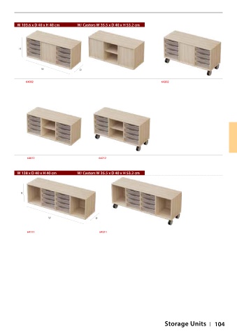 W 103.6 x D 40 x H 40 cm W/ Castors W 35.5 x D 40 x H 53.2 cm H W D 64002 64202 64012 64212 W 138 x D 40 x H 40 cm W/ Castors W 35.5 x D 40 x H 53.2 cm H W D 64111 64211 Storage Units 104