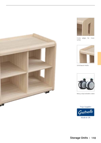 Curvy edges for more safety Solid beech Profile Heavy-duty lockable casters Trays Supplier Made in UK Storage Units 110