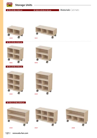 Storage Units W 70 x D 40 x H 42 cm W 103.5 x D 40 x H 42 cm Materials Cabinets 45440 45441 W 70 x D 40 x H 69 cm 45442 45443 W 70 x D 40 x H 96 cm 45444 45445 W 103.5 x D 40 x H 69 cm 45446 45447 45448 121 www.edu-fun.com