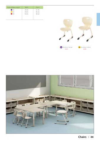 Chairs & Tables Height Tables Chairs C2 53 cm 31 cm C3 59 cm 35 cm C4 64 cm 38 cm C2 30 x 32 cm - H. 31 cm C3 30 x 32 cm - H. 35 cm 43527 43528 Chairs 44
