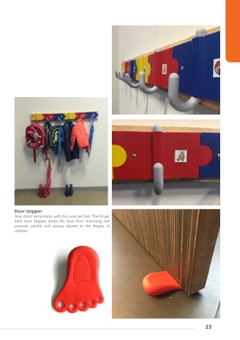 Door stopper Stop doors temporarily with this cute red foot. The Finger Alert Door Stopper keeps the door from slamming and prevents painful and serious injuries to the fingers of children. 23