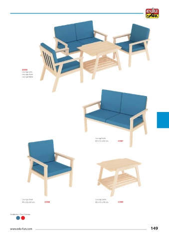 43906 Lounge sofa Lounge chair Lounge table Lounge sofa 89 x 52 x 60 cm 43907 Lounge chair Lounge table 49 x 52 x 60 cm 43908 60 x 45 x 40 cm 43909 Available in Two Colours www.edu-fun.com 149