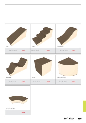 Slide Ladder Gentle Wave 100 x 50 x 50 cm 45980 100 x 50 x 50 cm 45981 100 x 50 x 50 cm 45982 Two waves Square Quadrant Corner 100 x 50 x 50 cm 45983 50 x 50 x 50 cm 45984 50 x 50 x 50 cm 45985 Semi-Circular Mat 45986 Soft Play 150