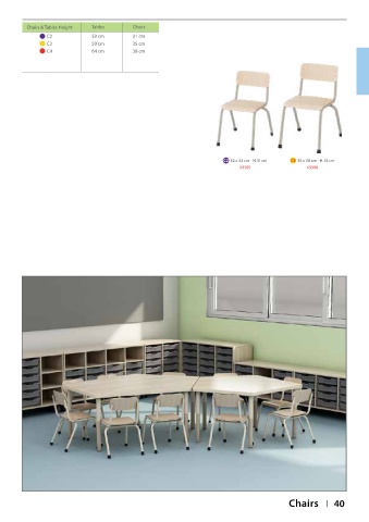 Chairs & Tables Height Tables Chairs C2 53 cm 31 cm C3 59 cm 35 cm C4 64 cm 38 cm C2 32 x 32 cm - H. 31 cm C3 36 x 38 cm - H. 35 cm 43505 43506 Chairs 40